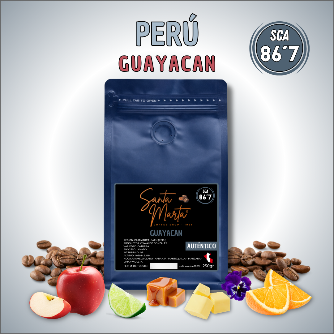 GUAYACAN nace en Jaén, Cajamarca, una de las zonas más reconocidas de Perú por la calidad y la personalidad de sus cafés de altura. Este lote procede de la finca El Guayacán, de Oswaldo Gonzales, un pequeño productor que trabaja una hectárea de cultivo a 1.889 m.s.n.m., en un entorno donde la altitud, el clima y el ritmo de la cosecha favorecen una maduración pausada y una expresión aromática muy definida. Se trata de un Caturra lavado, cosecha 2025-26, que refleja con claridad la identidad de un café peruano bien trabajado: limpio, preciso y lleno de matices.